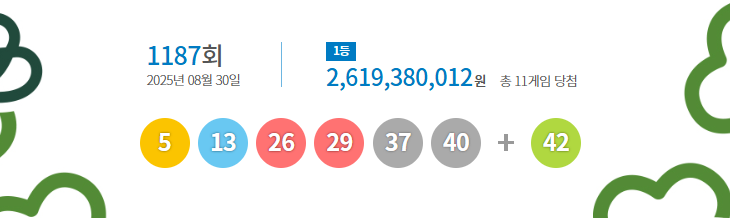 2025년 8월 30일 제1187회 로또 1등 당첨번호 결과