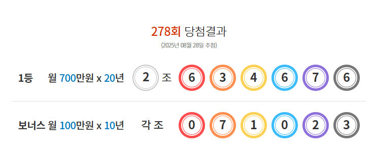 2025년 8월 28일(목요일) 진행된 제278회 연금복권 720+ 추첨 및 발표 내용입니다. 아래에서 1등부터 보너스 번호까지 자세히 확인하세요!